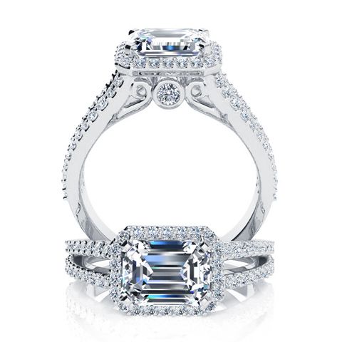 This antique style engagement ring stuns with an emerald shape center diamond that has been clarity enhanced. The center diamond measures approximately 7x5mm at 1.00 carats. It is surrounded by 72 diamonds in a halo and along the band totaling at 0.42 carats. Total gem weight of the ring is approximately 1.42 carats in H-I color, SI1-SI2 clarity. This ring is in 14 karat white gold.