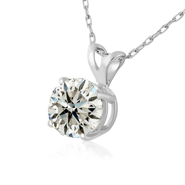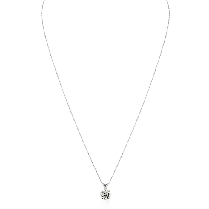 This classic solitaire necklace features a 1 1/2 carat clarity enhanced round shape natural diamond in I-J color, I3 clarity. This necklace is in 14 karat white gold.