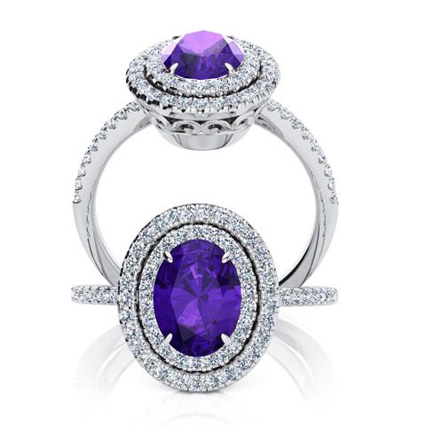 1 1/2 Carat Oval Shape Amethyst and Double Halo Diamond Ring In 14 Karat White Gold