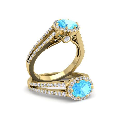 This stunning gemstone and halo diamond ring features one 7x5mm oval shape blue topaz gemstone at 1.00 carats. It is surrounded by 70 sparkling diamonds in a halo and down the band in H-I color, I1-I2 clarity at 0.41 carats. Total gem weight is 1.41 carats. This ring is crafted in 14 karat yellow gold.