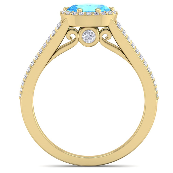 This stunning gemstone and halo diamond ring features one 7x5mm oval shape blue topaz gemstone at 1.00 carats. It is surrounded by 70 sparkling diamonds in a halo and down the band in H-I color, I1-I2 clarity at 0.41 carats. Total gem weight is 1.41 carats. This ring is crafted in 14 karat yellow gold.