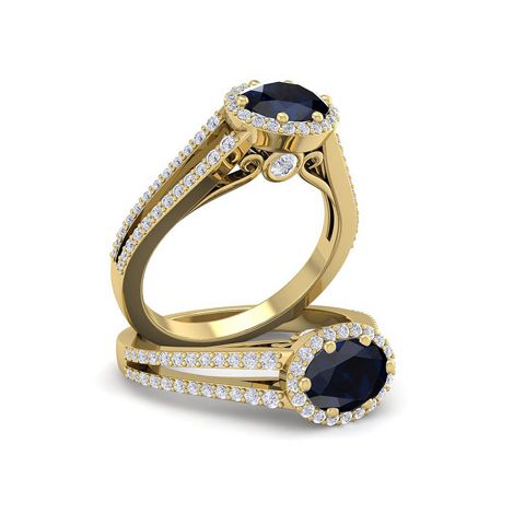 This stunning gemstone and halo diamond ring features one 7x5mm oval shape sapphire gemstone at 1.00 carats. It is surrounded by 70 sparkling diamonds in a halo and down the band in H-I color, I1-I2 clarity at 0.41 carats. Total gem weight is 1.41 carats. This ring is crafted in 14 karat yellow gold.
