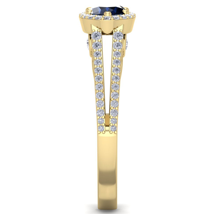 This stunning gemstone and halo diamond ring features one 7x5mm oval shape sapphire gemstone at 1.00 carats. It is surrounded by 70 sparkling diamonds in a halo and down the band in H-I color, I1-I2 clarity at 0.41 carats. Total gem weight is 1.41 carats. This ring is crafted in 14 karat yellow gold.