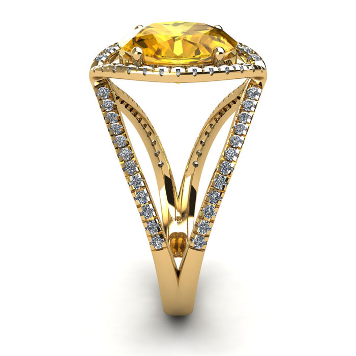 This stunning gemstone and halo diamond ring features one 8x6mm oval shape citrine gemstone at 0.80 carats. It is surrounded by 86 sparkling diamonds in a halo and down the split shank band in H-I color, I1-I2 clarity at 0.43 carats. Total gem weight is 1.03 carats. This ring is crafted in 14 karat yellow gold.