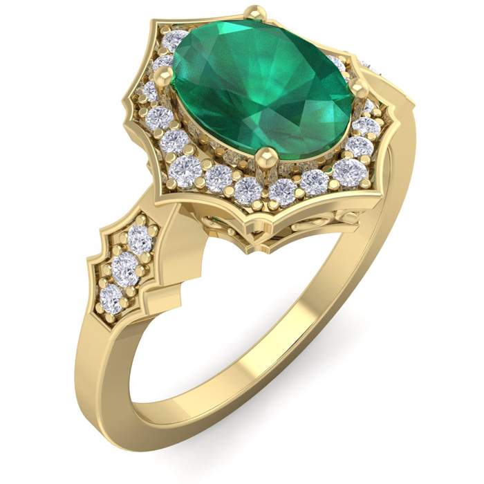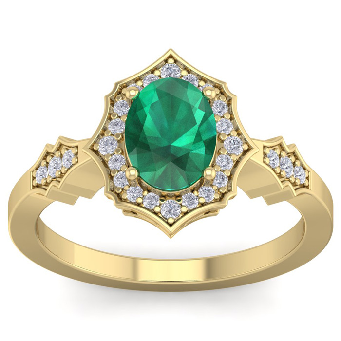 This elegant gemstone ring features one 8x6mm oval shape emerald gemstone at approximately 1.15 carats. It is surrounded by 26 sparkling diamonds in I-J color, I1-I2 clarity at 1/4 carat total weight. Total gem weight is approximately 1.40 carat total weight. This ring is in 14 karat yellow gold.