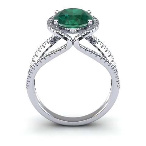 This stunning gemstone and halo diamond ring features one 8x6mm oval shape emerald gemstone at 1.15 carats. It is surrounded by 86 sparkling diamonds in a halo and down the split shank band in H-I color, I1-I2 clarity at 0.43 carats. Total gem weight is 1.58 carats. This ring is crafted in 14 karat white gold.