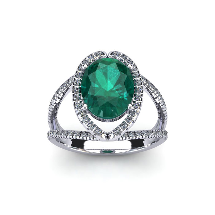 This stunning gemstone and halo diamond ring features one 8x6mm oval shape emerald gemstone at 1.15 carats. It is surrounded by 86 sparkling diamonds in a halo and down the split shank band in H-I color, I1-I2 clarity at 0.43 carats. Total gem weight is 1.58 carats. This ring is crafted in 14 karat white gold.