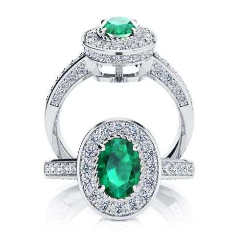 1 1/2 Carat Oval Shape Emerald and Halo Diamond Ring In 14 Karat White Gold
