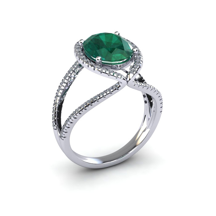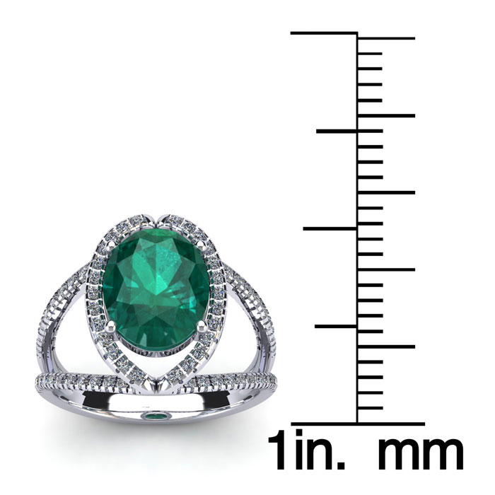 Retrograde Birthstones™ 1 1/2 Carat Oval Shape Emerald and Halo Diamond Ring In 14 Karat White Gold