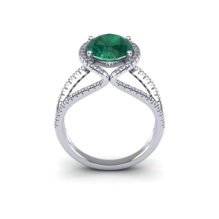 This stunning gemstone and halo diamond ring features one 8x6mm oval shape emerald gemstone at 1.15 carats. It is surrounded by 86 sparkling diamonds in a halo and down the split shank band in H-I color, I1-I2 clarity at 0.43 carats. Total gem weight is 1.58 carats. This ring is crafted in 14 karat white gold. *Retrograde Birthstones™ flips the idea of traditional birthstones. Wear your ½ birthday birthstone, your Retrograde Birthstone, “The Birthstone For Your Bad Side™.