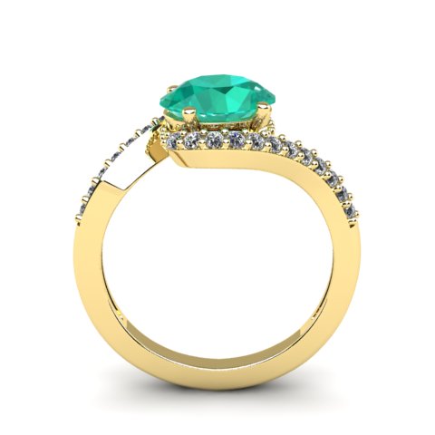This stunning gemstone and diamond ring features one 8x6mm oval shape sideways emerald gemstone at 1.15 carats. It is surrounded by 30 sparkling diamonds in a halo in I-J color, I1-I2 clarity at 0.30 carats. Total gem weight is 1.45 carats. This ring is crafted in 14 karat yellow gold.