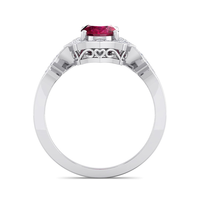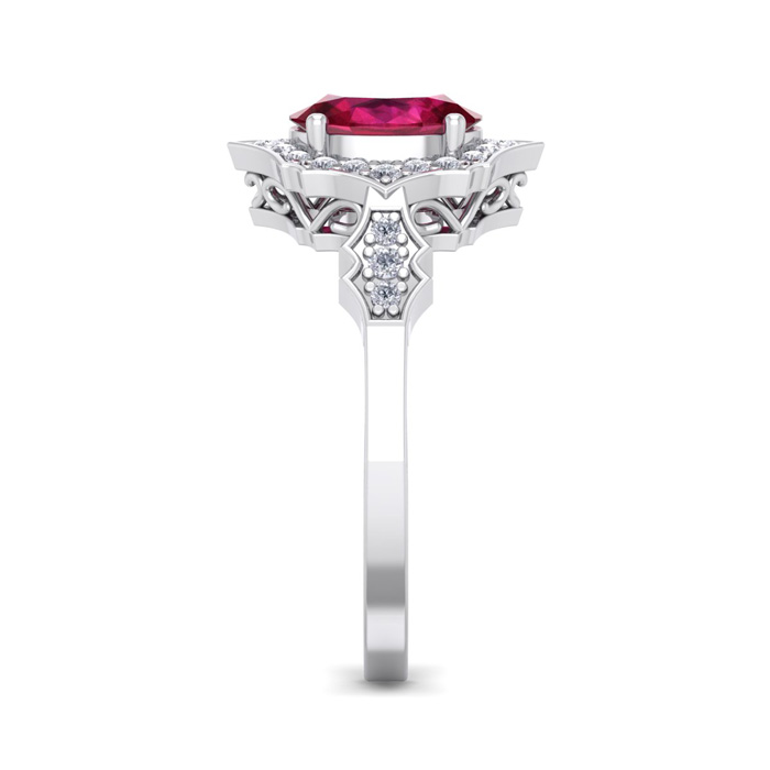 This ruby ring features one 8x6mm oval shape created ruby gemstone. It is surrounded by 26 sparkling diamonds totaling 1/4 carat in I-J color, I1-I2 clarity. Total carat weight is approximately 1 1/2 carats. This ring is in sterling silver. *Retrograde Birthstones™ flips the idea of traditional birthstones. Wear your ½ birthday birthstone, your Retrograde Birthstone, “The Birthstone For Your Bad Side™.