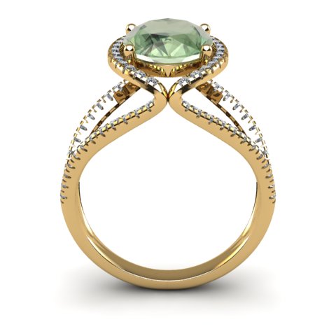 This stunning gemstone and halo diamond ring features one 8x6mm oval shape green amethyst gemstone at 1.05 carats. It is surrounded by 86 sparkling diamonds in a halo and down the split shank band in H-I color, I1-I2 clarity at 0.43 carats. Total gem weight is 1.48 carats. This ring is crafted in 14 karat yellow gold.