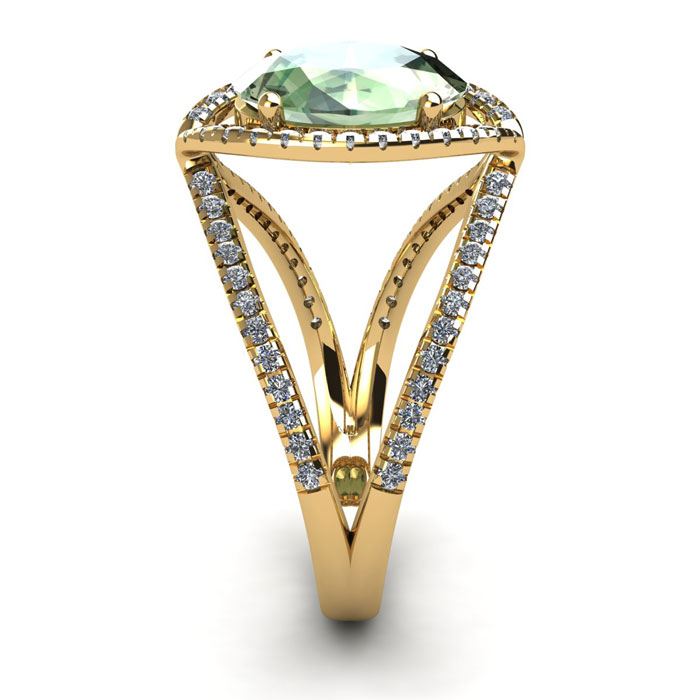 This stunning gemstone and halo diamond ring features one 8x6mm oval shape green amethyst gemstone at 1.05 carats. It is surrounded by 86 sparkling diamonds in a halo and down the split shank band in H-I color, I1-I2 clarity at 0.43 carats. Total gem weight is 1.48 carats. This ring is crafted in 14 karat yellow gold.
