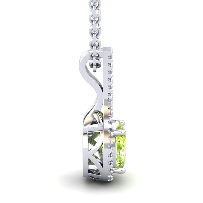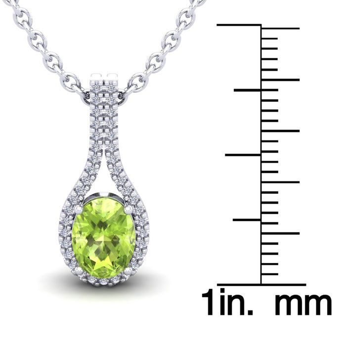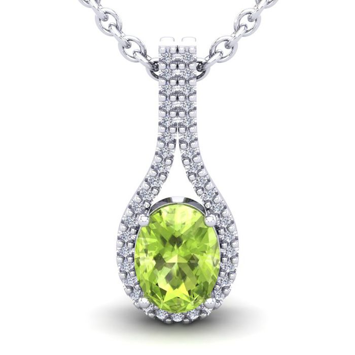 1 1/2 Carat Oval Shape Peridot and Halo Diamond Necklace In 14 Karat White Gold, 18 Inches