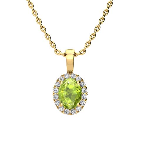 1 1/2 Carat Oval Shape Peridot and Halo Diamond Necklace In 14 Karat Yellow Gold With 18 Inch Chain