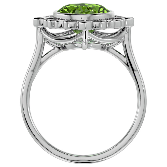 This elegant gemstone ring features one 8x6mm oval shape peridot gemstone at approximately 1.35 carats. It is surrounded by 20 sparkling diamonds in I-J color, I1-I2 clarity at 1/5 carat total weight. Total gem weight is approximately 1 1/2 carats. This ring is in 14 karat white gold.