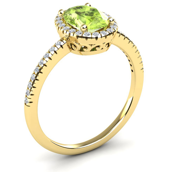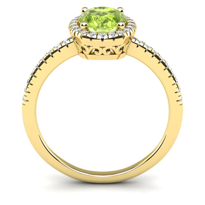This stunning gemstone and halo diamond ring features one 8x6mm oval shape peridot gemstone at 1.35 carats. It is surrounded by 40 sparkling diamonds in a halo and down the band in I-J color, I1-I2 clarity at 0.20 carats. Total gem weight is 1.55 carats. This ring is crafted in 14 karat yellow gold.