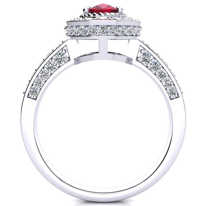 This stunning gemstone and halo diamond ring features one 7x5mm oval shape ruby gemstone at 0.95 carats. It is surrounded by 71 sparkling diamonds in a halo and down the band in I-J color, I1-I2 clarity at 0.68 carats. Total gem weight is 1.63 carats. This ring is crafted in 14 karat white gold.