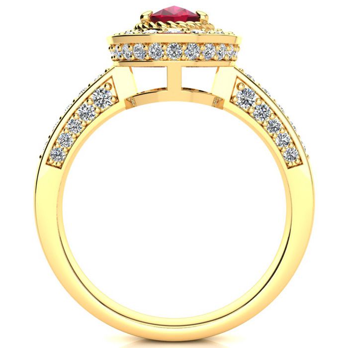This stunning gemstone and halo diamond ring features one 7x5mm oval shape ruby gemstone at 0.95 carats. It is surrounded by 71 sparkling diamonds in a halo and down the band in I-J color, I1-I2 clarity at 0.68 carats. Total gem weight is 1.63 carats. This ring is crafted in 14 karat yellow gold.