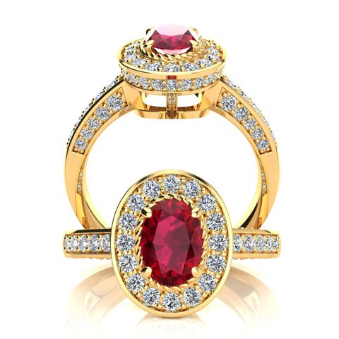 1 1/2 Carat Oval Shape Ruby and Halo Diamond Ring In 14 Karat Yellow Gold