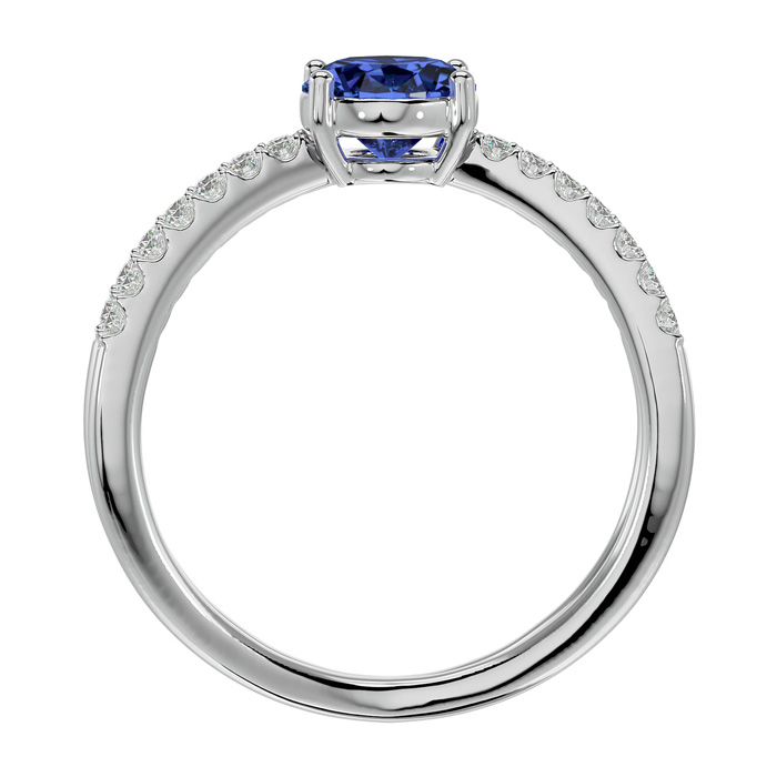 This elegant gemstone ring features one 8x6mm oval shape tanzanite gemstone at approximately 1.30 carats. It is surrounded by 28 sparkling diamonds in I-J color, I1-I2 clarity at 1/4 carat total weight. Total gem weight is approximately 1 1/2 carats. This ring is in 14 karat white gold.