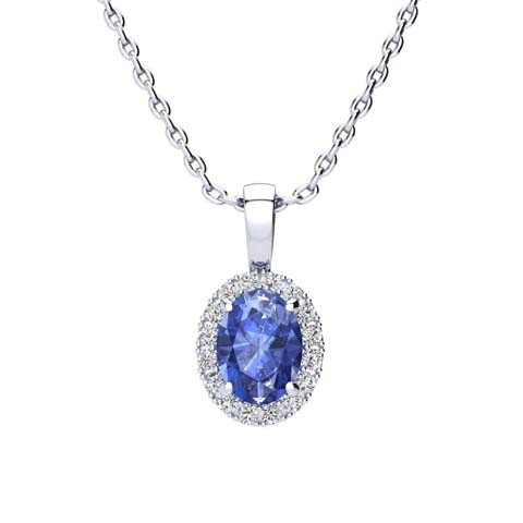 1 1/2 Carat Oval Shape Tanzanite and Halo Diamond Necklace In 14 Karat White Gold With 18 Inch Chain