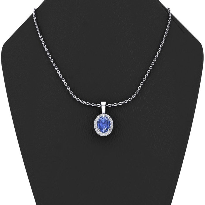 1 1/2 Carat Oval Shape Tanzanite and Halo Diamond Necklace In 14 Karat White Gold With 18 Inch Chain