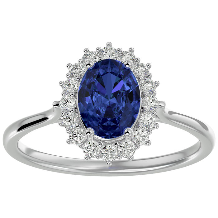This elegant gemstone ring features one 8x6mm oval shape tanzanite gemstone at approximately 1.30 carats. It is surrounded by 16 sparkling diamonds in I-J color, I1-I2 clarity at 1/4 carat total weight. Total gem weight is approximately 1 1/2 carats. This ring is in 14 karat white gold.