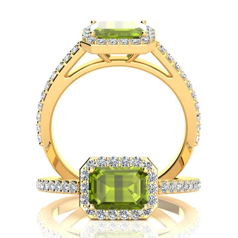 This stunning gemstone and halo diamond ring features one 7x5mm emerald shape peridot gemstone at 1.15 carats. It is surrounded by 42 sparkling diamonds in a halo and down the band in H-I color, I1-I2 clarity at 0.31 carats. Total gem weight is 1.46 carats. This ring is crafted in 14 karat yellow gold.