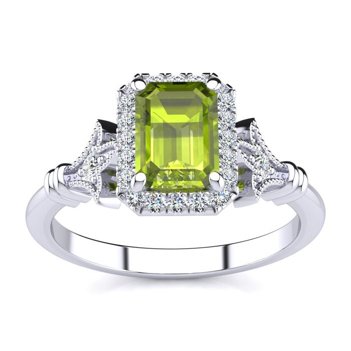 1 1/2 Carat Peridot and Halo Diamond Vintage Ring In 14 Karat White Gold