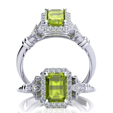 This stunning gemstone and halo diamond vintage ring features one 7x5mm emerald cut peridot gemstone at 1.15 carats. It is surrounded by 22 sparkling diamonds in a halo and down the band in H-I color, I1-I2 clarity at 0.25 carats. Total gem weight is 1.40 carats. This ring is crafted in 14 karat white gold.