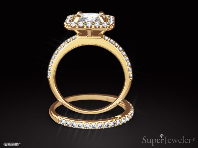 1 1/2 Carat Princess Cut Floating Pave Halo Diamond Bridal Set in 14k Yellow Gold