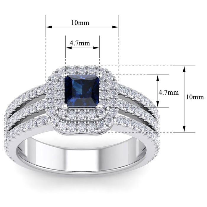 This elegant diamond engagement ring features a 0.60 carat princess shape center sapphire. It is surrounded by 116 diamonds in a double halo and along the band totaling 0.90 carats. Total carat weight is approximately 1 1/2 carats. Diamond color is H-I, diamond clarity SI2-I1. This ring is in 14 karat white gold.