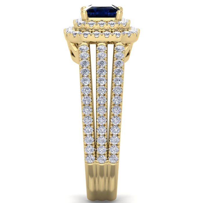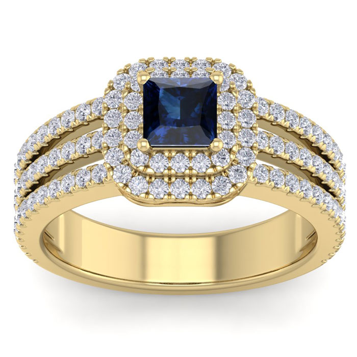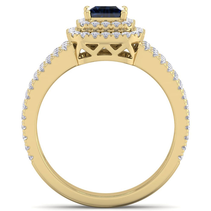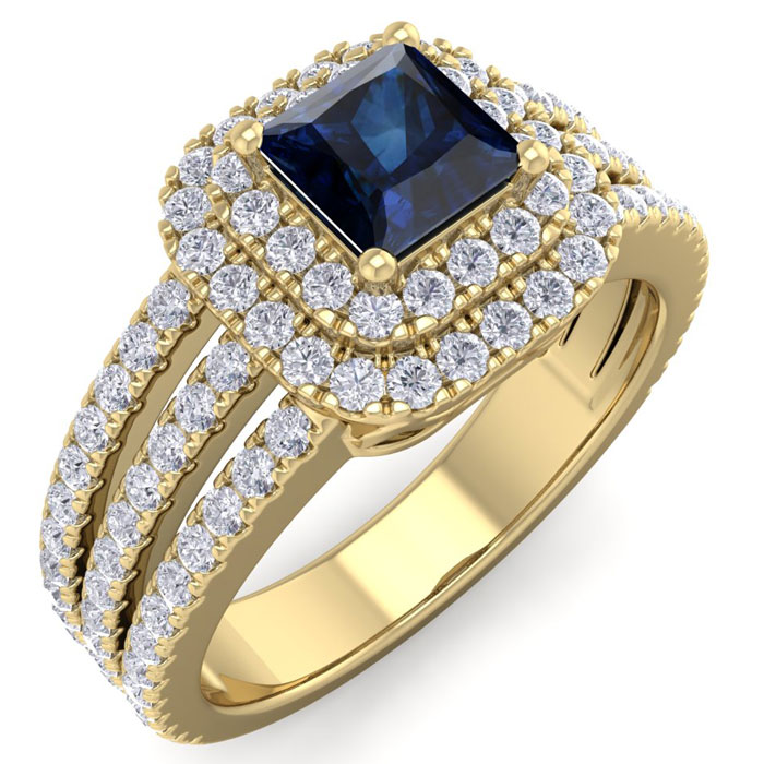 1 1/2 Carat Princess Shape Double Halo Sapphire and Diamond Engagement Ring In 14 Karat Yellow Gold