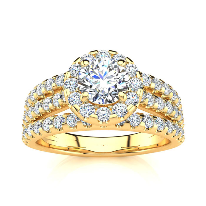 For a classically beautiful lab grown diamond engagement ring, try this engagement ring crafted in 14 karat yellow gold. This ring boasts a 1/2 carat center lab grown diamond that is surrounded by a halo of lab grown diamonds, and a three row shank adorned with accent lab grown diamonds. The ring has a total lab grown diamond weight of 1 1/2 carats. There are 63 lab grown diamonds total in G-H color and VS clarity.