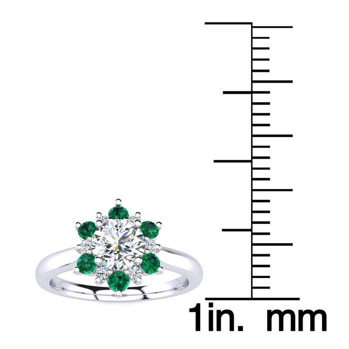 This ring features a 1 carat round shape center diamond in H-I color. There are 6 sparkling side diamonds and 6 emerald gemstones in a halo in SI2-I1 clarity at approximately 1/2 carat. Total gem weight is approximately 1 1/2 carats. This ring is in 14 karat white gold. Ring top measures 8x8mm.