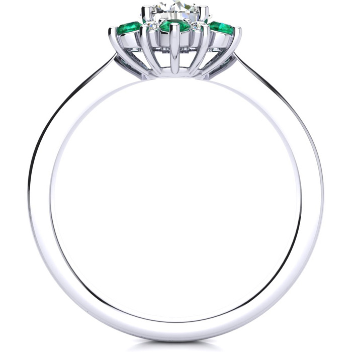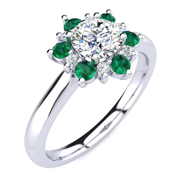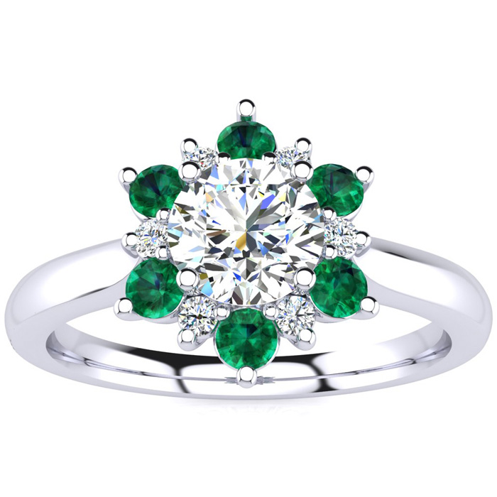 This ring features a clarity enhanced 1 carat round shape center diamond in I-J color. There are 6 sparkling side diamonds and 6 emerald gemstones in a halo in I1-I2 clarity at approximately 1/2 carat. Total gem weight is approximately 1 1/2 carats. This ring is in 14 karat white gold. Ring top measures 8x8mm.