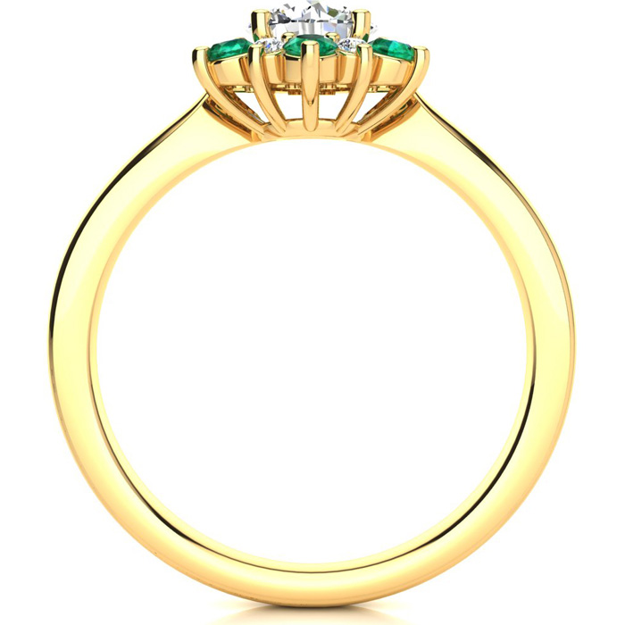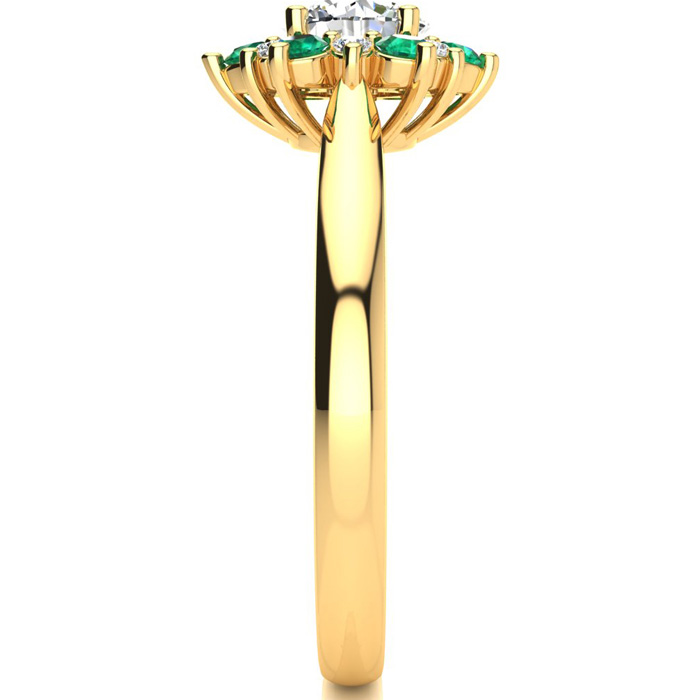 This ring features a clarity enhanced 1 carat round shape center diamond in I-J color. There are 6 sparkling side diamonds and 6 emerald gemstones in a halo in I1-I2 clarity at approximately 1/2 carat. Total gem weight is approximately 1 1/2 carats. This ring is in 14 karat yellow gold. Ring top measures 8x8mm.