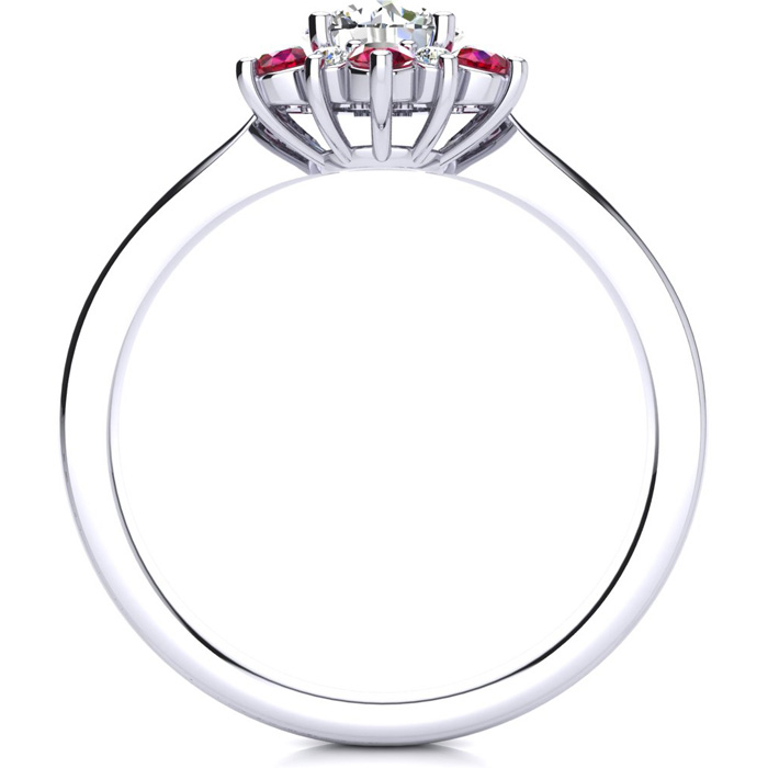 This ring features a 1 carat round shape center diamond in H-I color. There are 6 sparkling side diamonds and 6 ruby gemstones in a halo in SI2-I1 clarity at approximately 1/2 carat. Total gem weight is approximately 1 1/2 carats. This ring is in 14 karat white gold. Ring top measures 8x8mm.