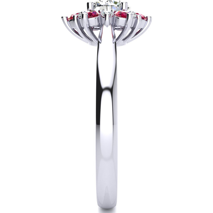 This ring features a clarity enhanced 1 carat round shape center diamond in I-J color. There are 6 sparkling side diamonds and 6 ruby gemstones in a halo in I1-I2 clarity at approximately 1/2 carat. Total gem weight is approximately 1 1/2 carats. This ring is in 14 karat white gold. Ring top measures 8x8mm.