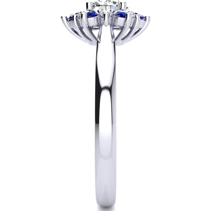 This ring features a 1 carat round shape center diamond in H-I color. There are 6 sparkling side diamonds and 6 sapphire gemstones in a halo in SI2-I1 clarity at approximately 1/2 carat. Total gem weight is approximately 1 1/2 carats. This ring is in 14 karat white gold. Ring top measures 8x8mm.