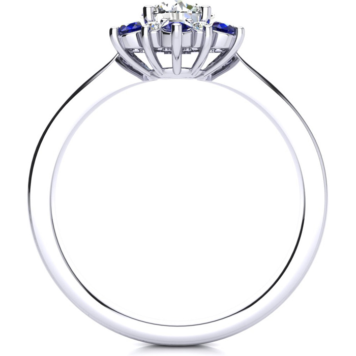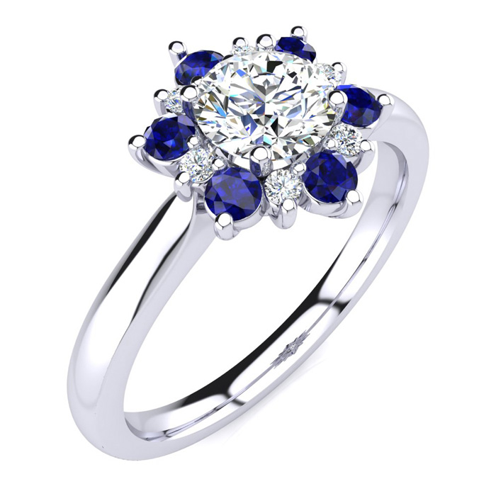 This ring features a clarity enhanced 1 carat round shape center diamond in I-J color. There are 6 sparkling side diamonds and 6 sapphire gemstones in a halo in I1-I2 clarity at approximately 1/2 carat. Total gem weight is approximately 1 1/2 carats. This ring is in 14 karat white gold. Ring top measures 8x8mm.