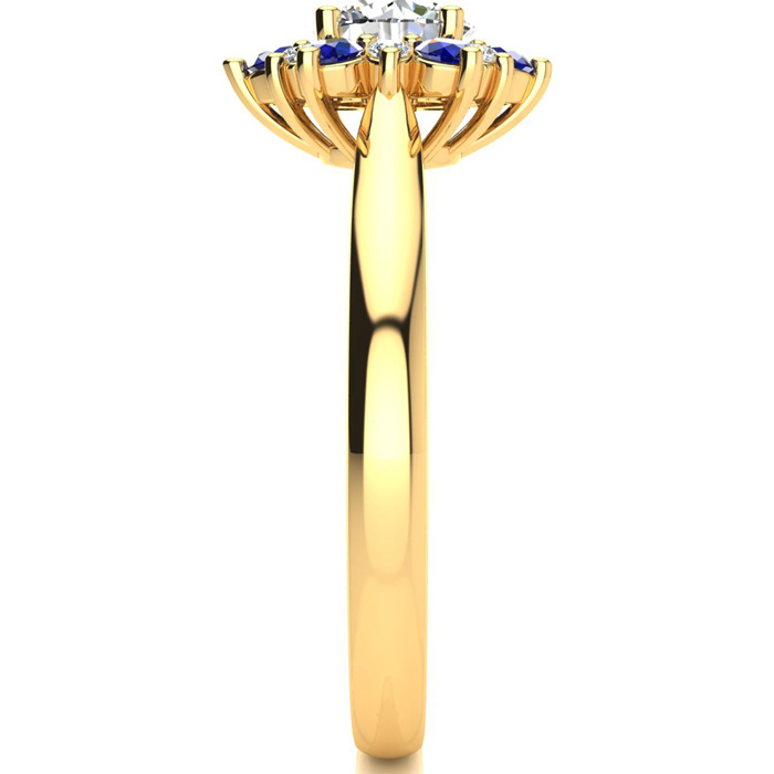 This ring features a 1 carat round shape center diamond in H-I color. There are 6 sparkling side diamonds and 6 sapphire gemstones in a halo in SI2-I1 clarity at approximately 1/2 carat. Total gem weight is approximately 1 1/2 carats. This ring is in 14 karat yellow gold. Ring top measures 8x8mm.