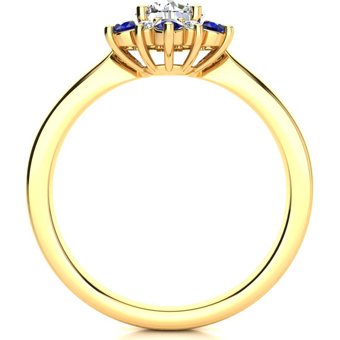 This ring features a clarity enhanced 1 carat round shape center diamond in I-J color. There are 6 sparkling side diamonds and 6 sapphire gemstones in a halo in I1-I2 clarity at approximately 1/2 carat. Total gem weight is approximately 1 1/2 carats. This ring is in 14 karat yellow gold. Ring top measures 8x8mm.