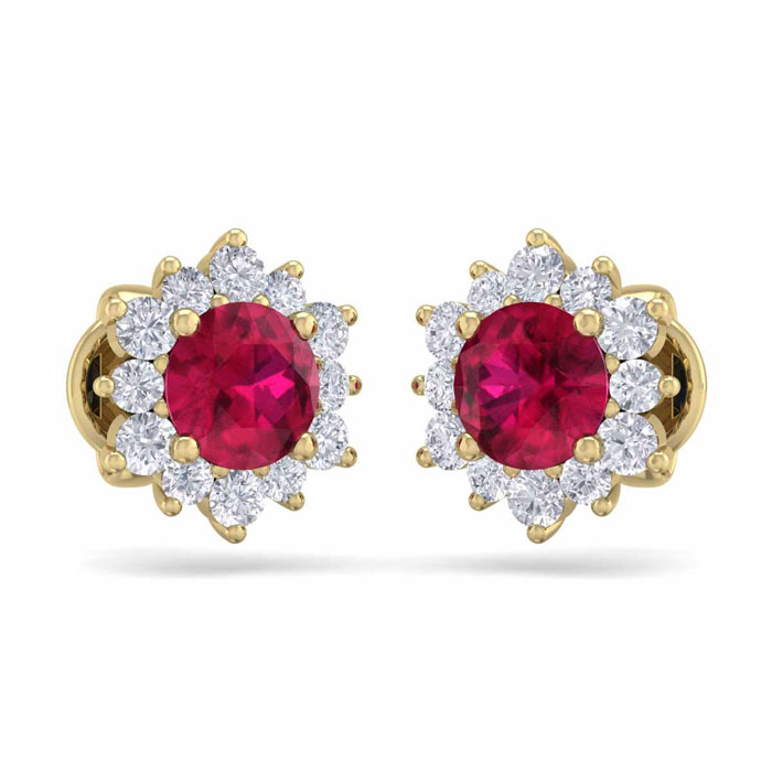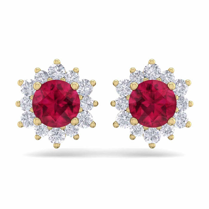 1 1/2 Carat Round Shape Flower Ruby and Diamond Halo Stud Earrings In 14 Karat Yellow Gold