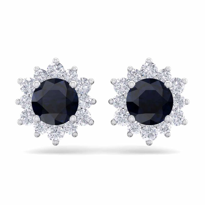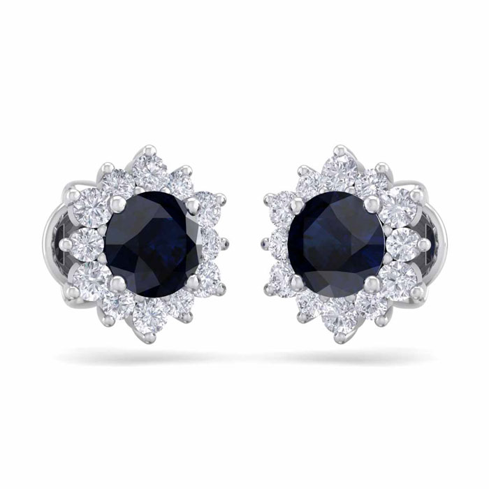 1 1/2 Carat Round Shape Flower Sapphire and Diamond Halo Stud Earrings In 14 Karat White Gold