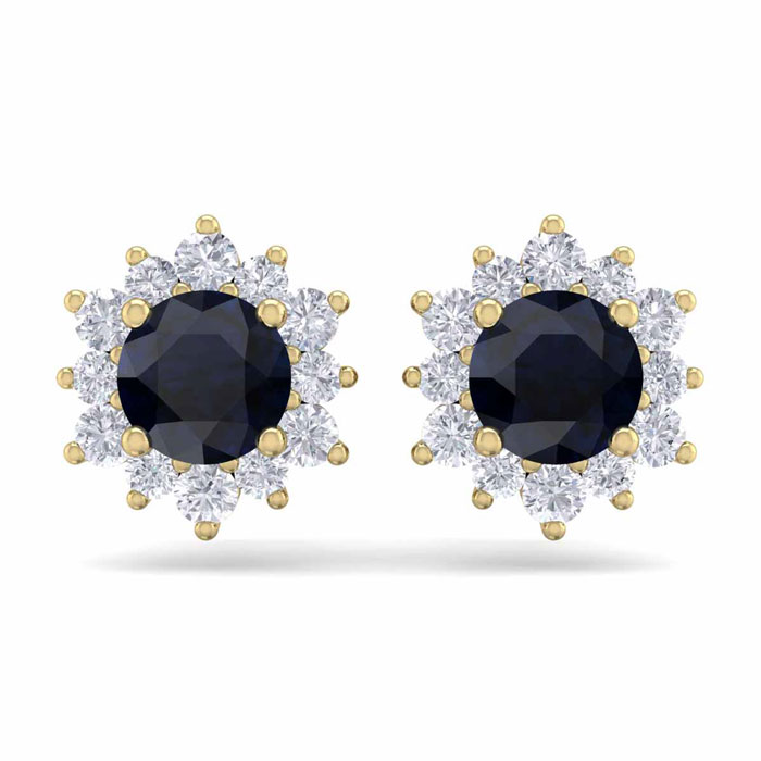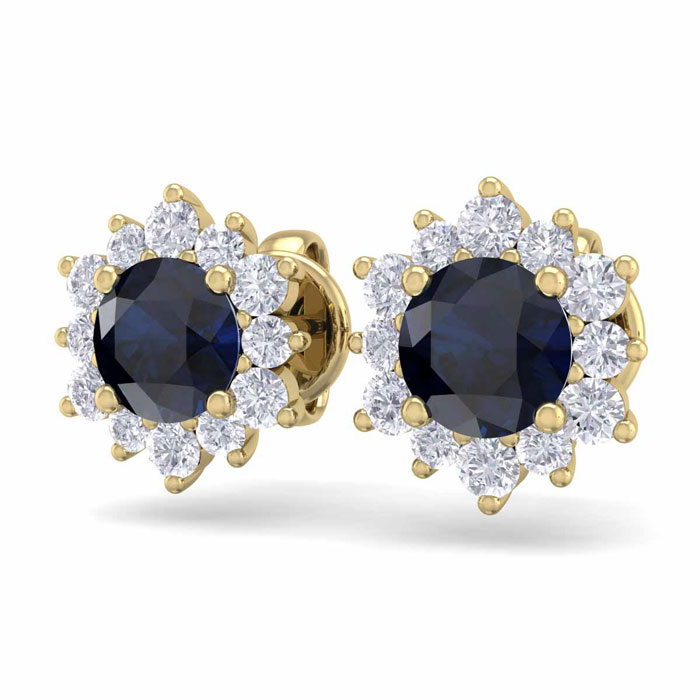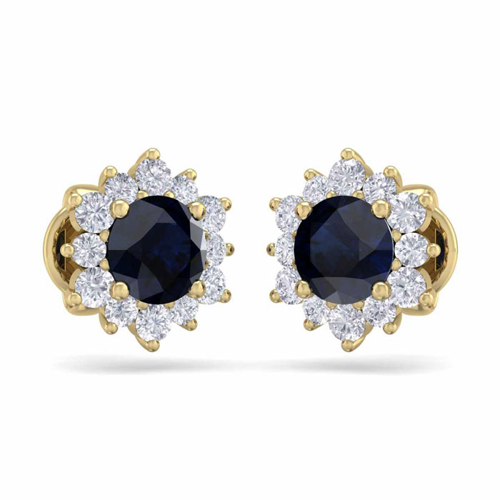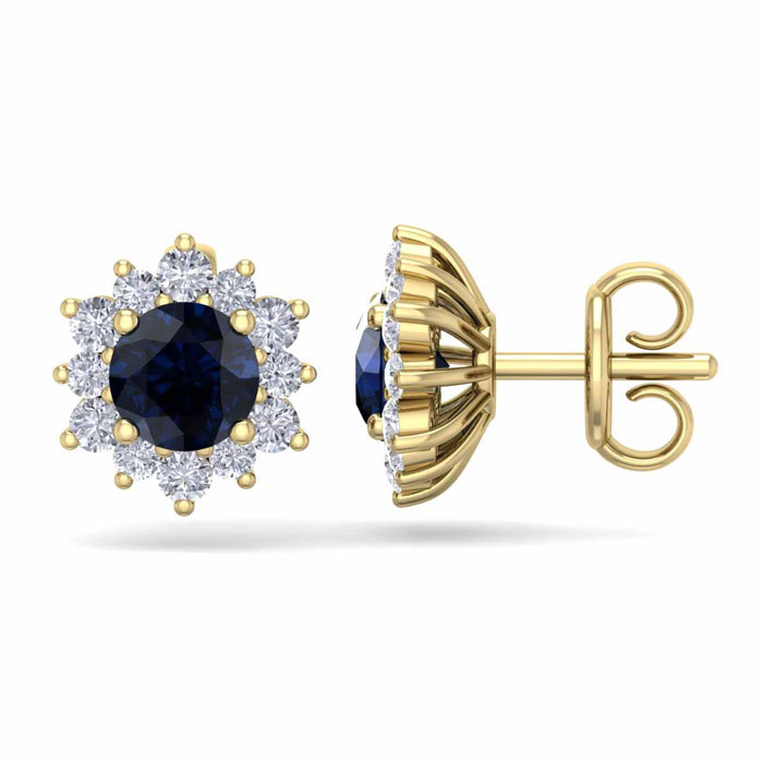 1 1/2 Carat Round Shape Flower Sapphire and Diamond Halo Stud Earrings In 14 Karat Yellow Gold