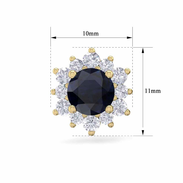 These elegant diamond stud earrings feature two 1/2 carat round shape center sapphire gemstones. They are surrounded by 24 diamonds in a halo totaling 1/2 carat. Total carat weight is approximately 1 1/2 carats. Diamond color is I-J color, I1-I2 clarity. These earrings are in 14 karat yellow gold and have comfortable and secure post with friction backs.