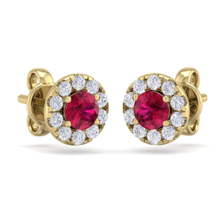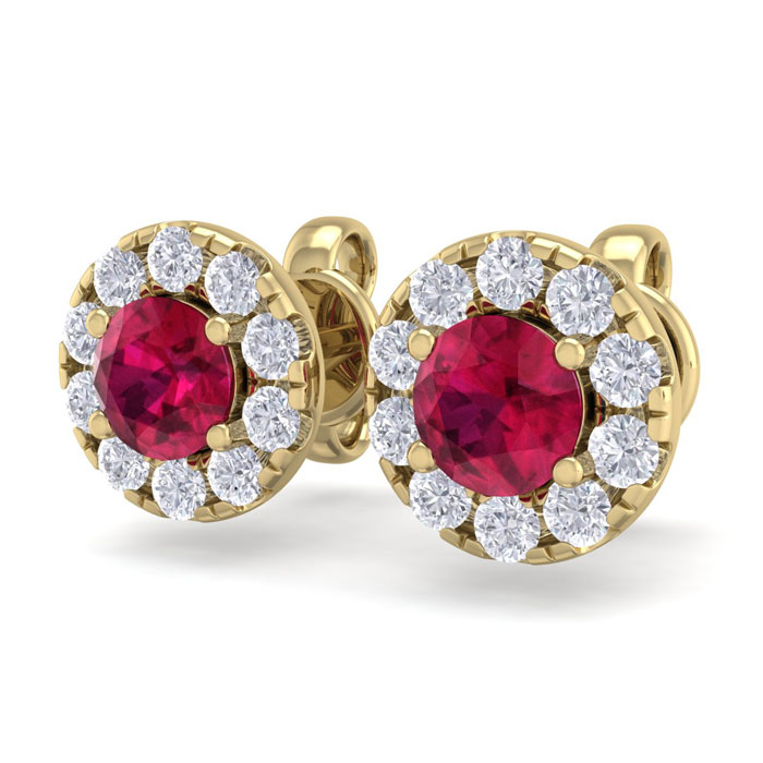 1 1/2 Carat Ruby and Diamond Halo Stud Earrings In 14 Karat Yellow Gold